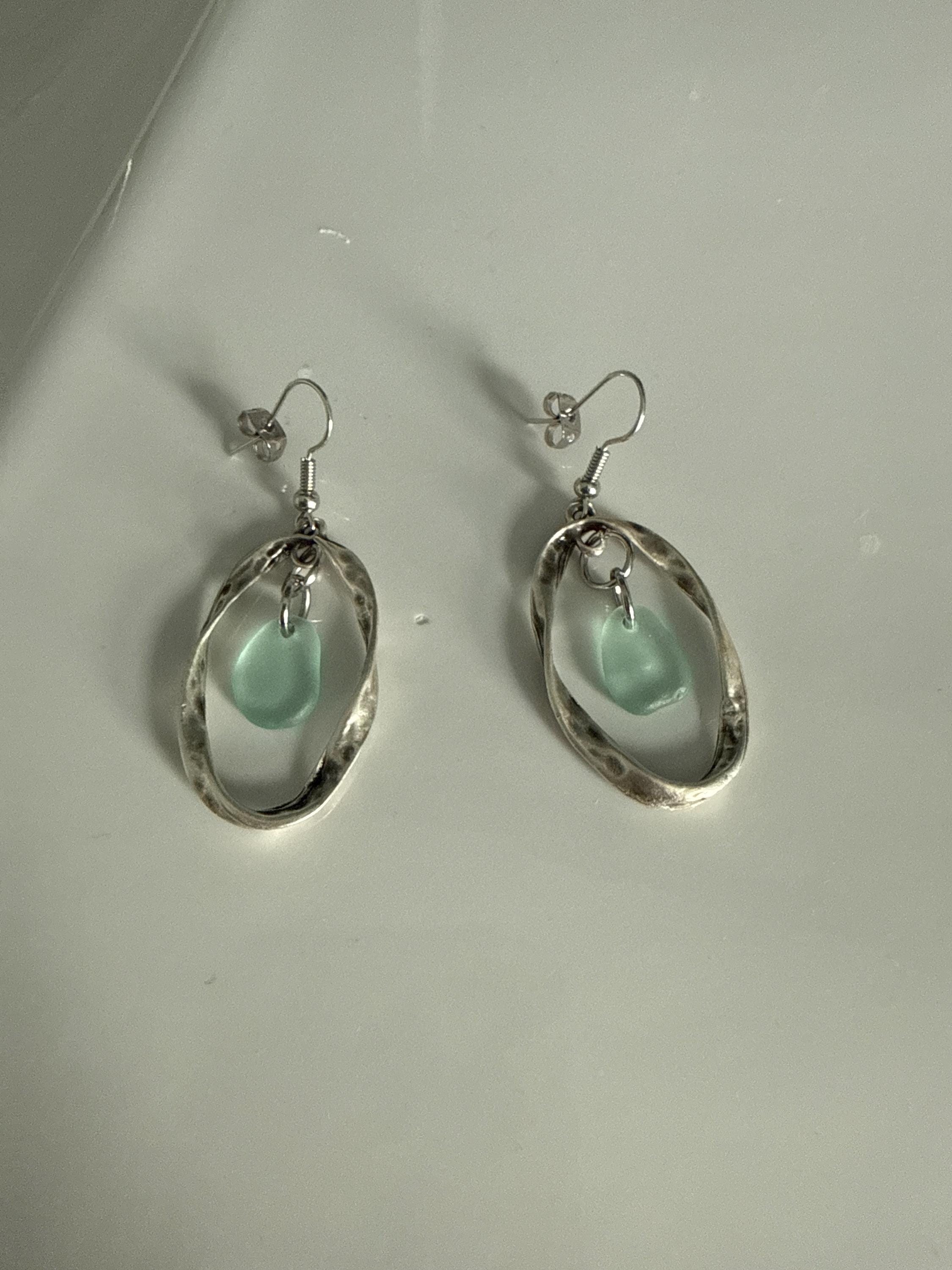 Genuine aqua blue sea glass and antiqued silver hammered oval earrings. These unique earrings measure 2 inches long and .75 inches wide. Blue sea glass found along the Salish Sea on Vancouver Island.