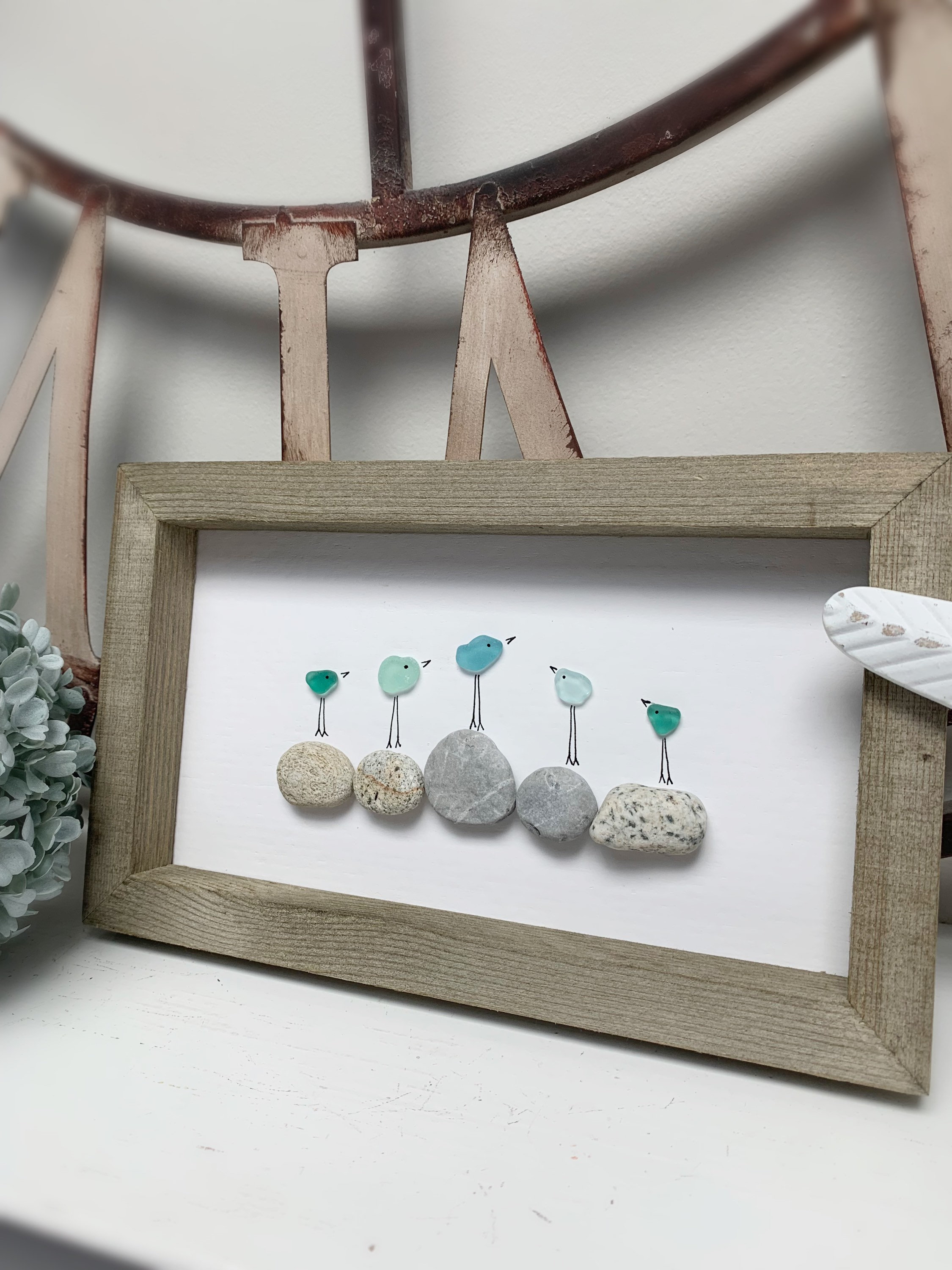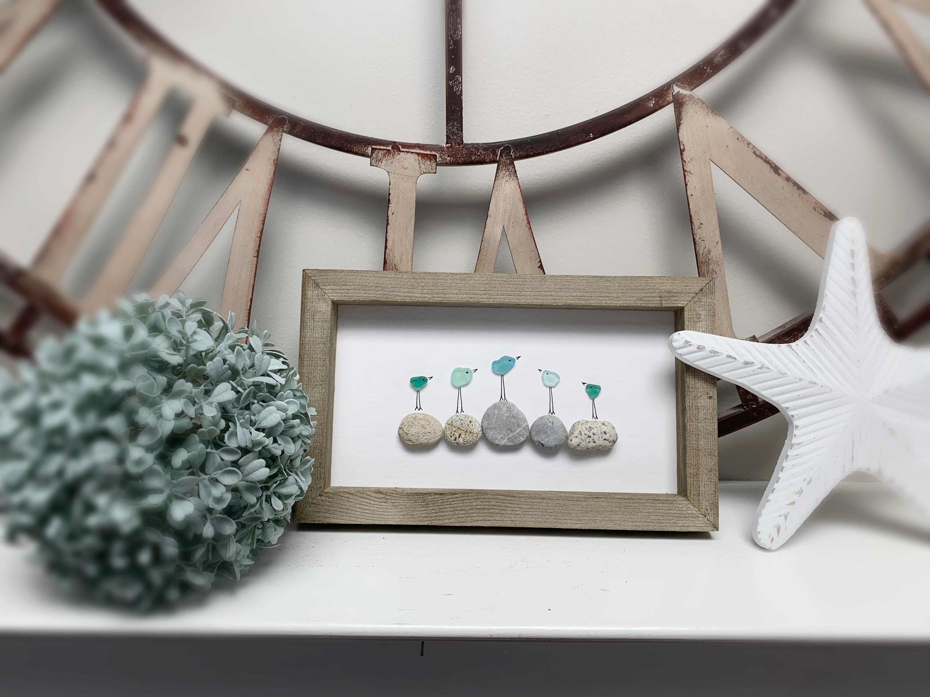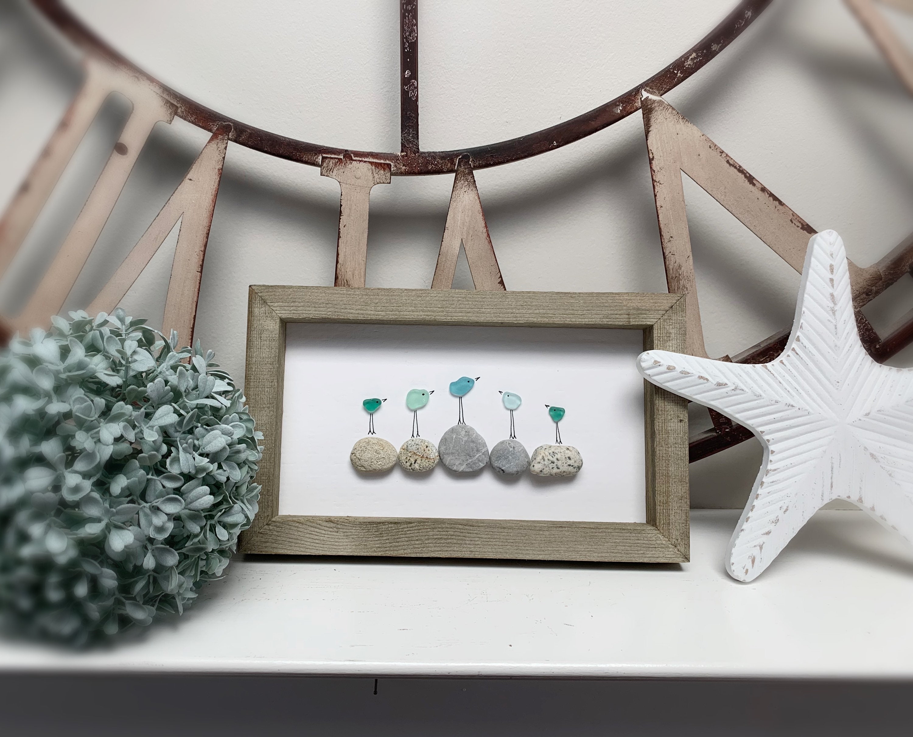 Aqua Blue and Turquoise Sea Glass Birds on beach pebbles found on Vancouver Island. Rustic 10 x 6 wood frame with hook on back. Looks great on a mantle, shelf or wall. Perfect gift for seaglass/ocean lover/bird lover or better yet, treat yourself š¤