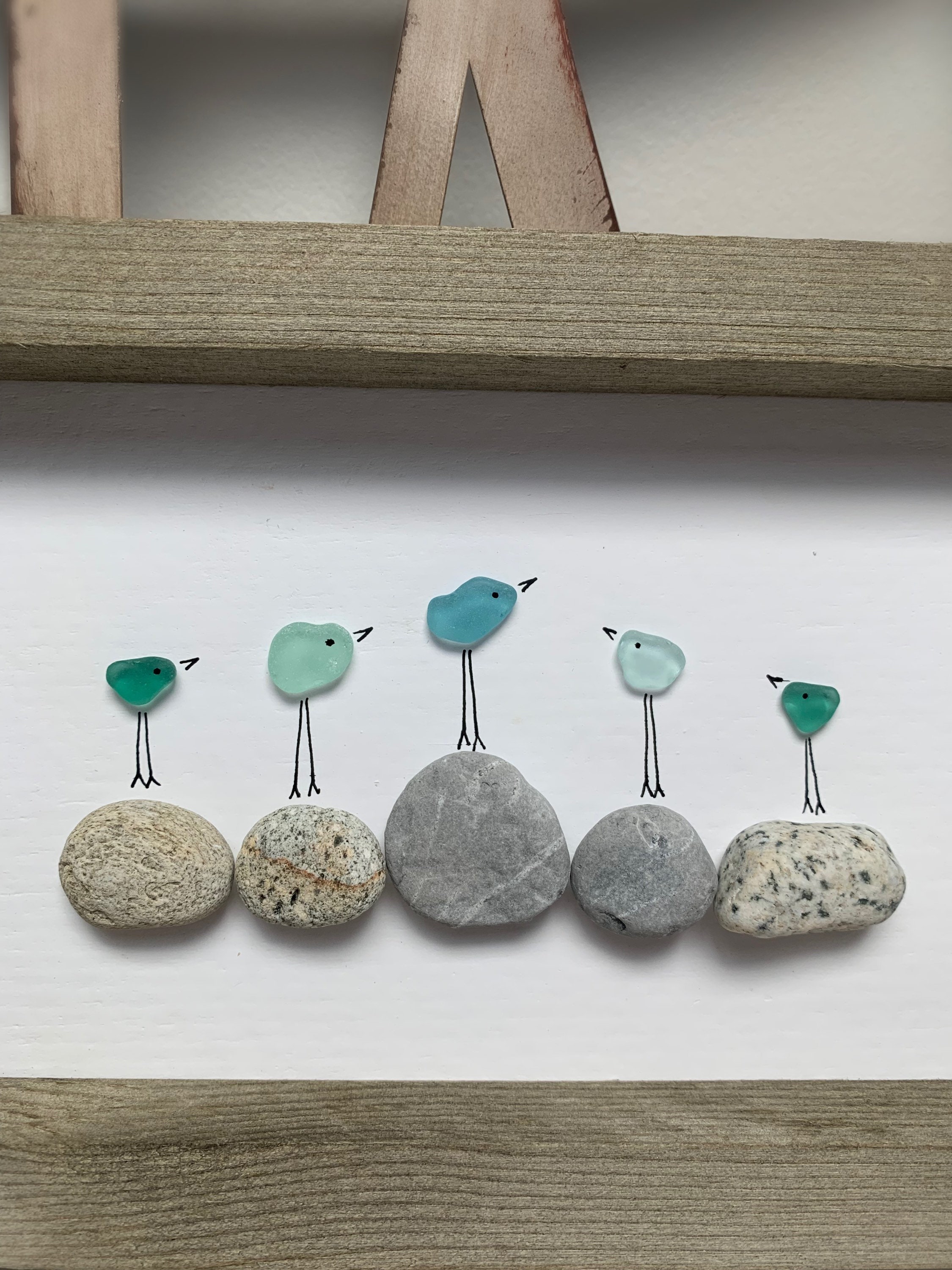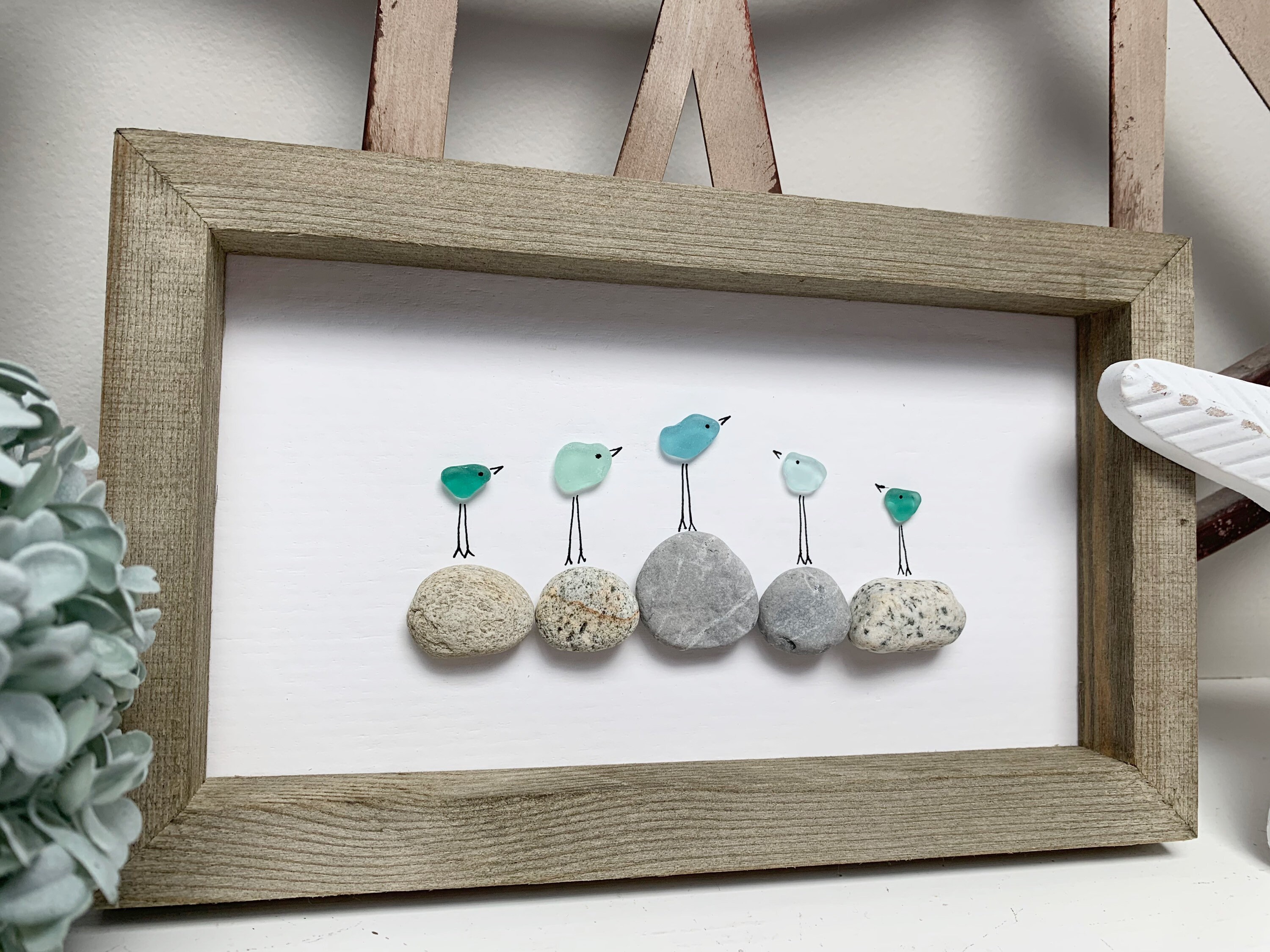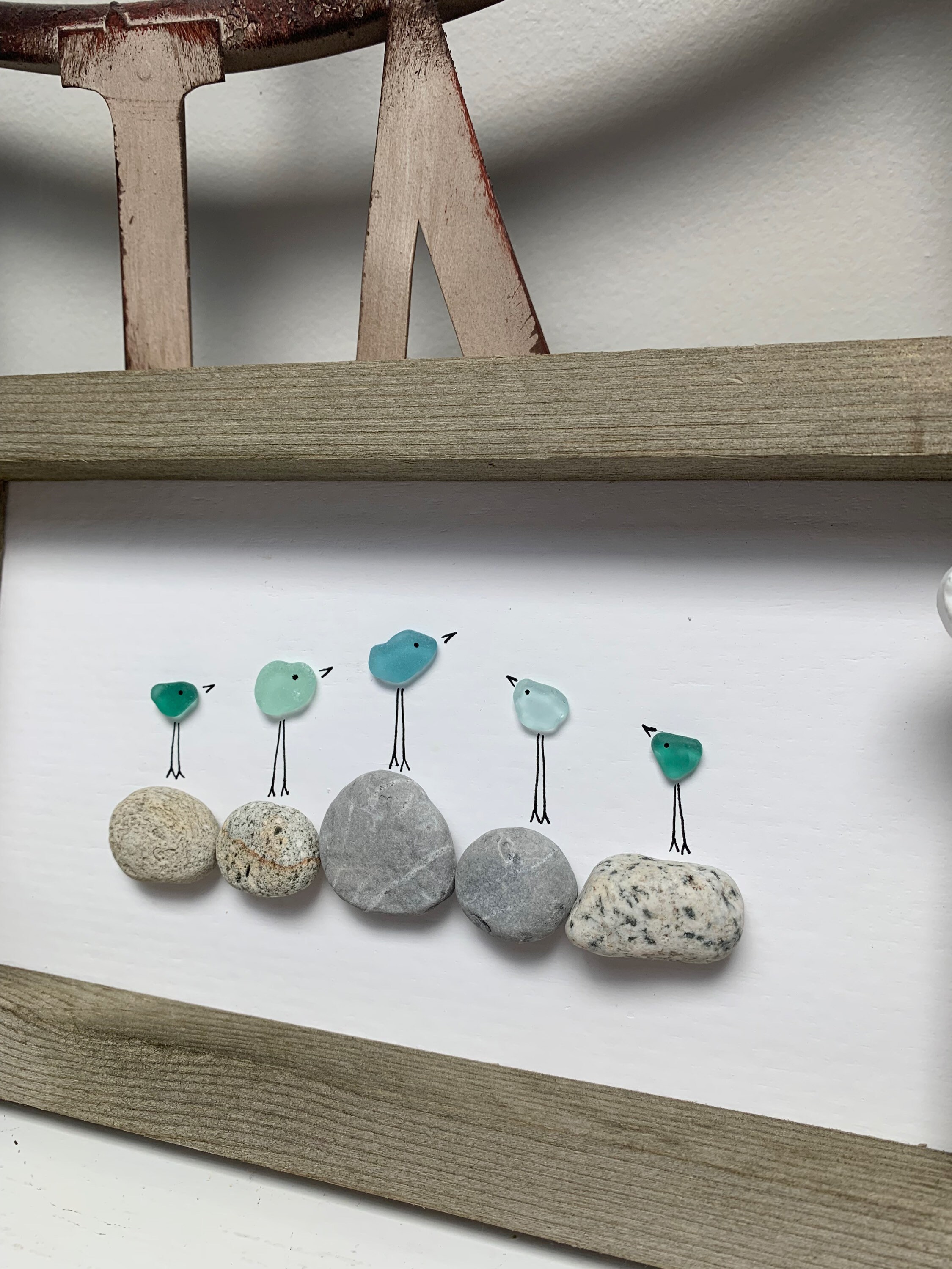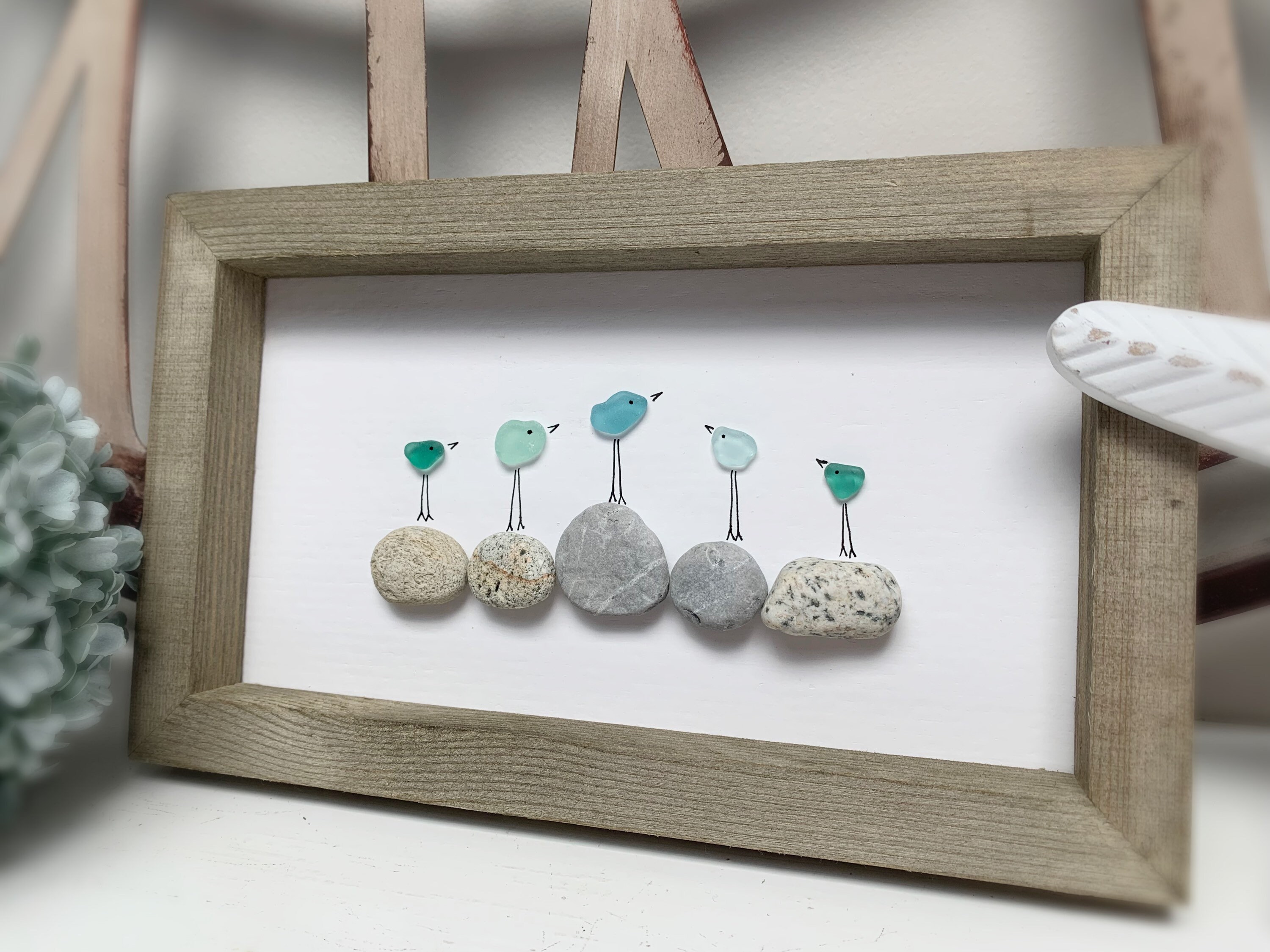 Aqua Blue and Turquoise Sea Glass Birds on beach pebbles found on Vancouver Island. Rustic 10 x 6 wood frame with hook on back. Looks great on a mantle, shelf or wall. Perfect gift for seaglass/ocean lover/bird lover or better yet, treat yourself š¤