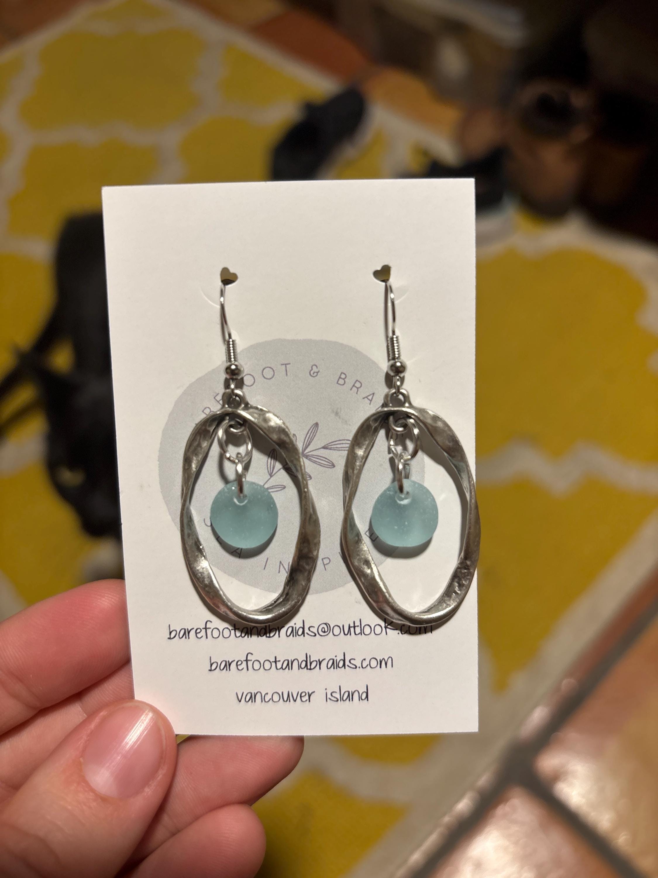 Try to keep jewelry dry at all times. Water, sweat, etc can be hard on metal. If you want your seaglass colour to “pop” add a tiny amount of oil (I use olive oil) and rub on glass.