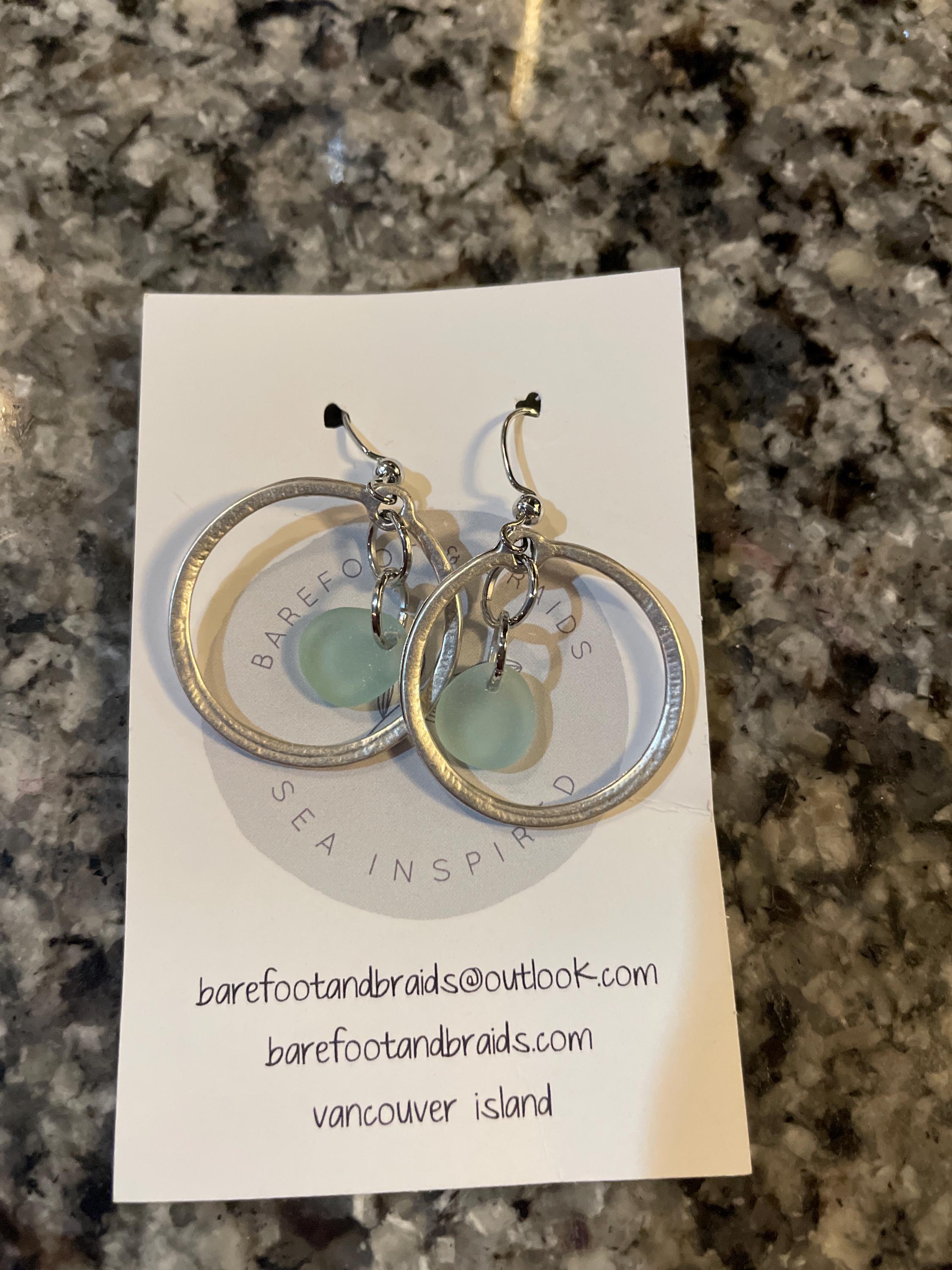Genuine light aqua blue sea glass and antiqued silver hammered hoop earrings. These unique earrings measure 2 inches long and 1.25 inches wide. Blue sea glass found along the Salish Sea on Vancouver Island.