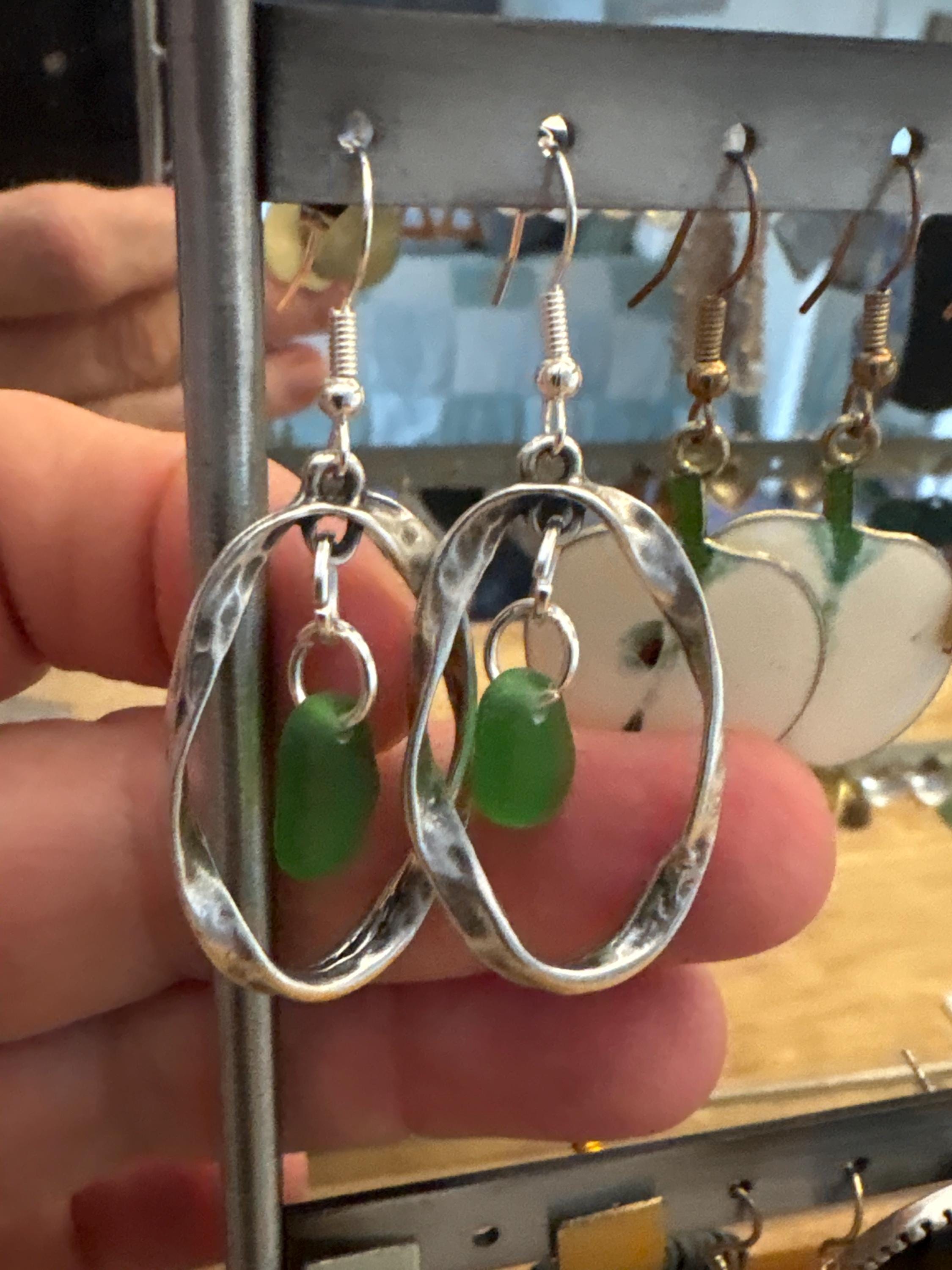 Genuine ocean tumbled green sea glass and antiqued silver hammered oval earrings. These unique earrings measure 2 inches long and .75 inches wide. This sea glass was found along the Salish Sea on Vancouver Island.