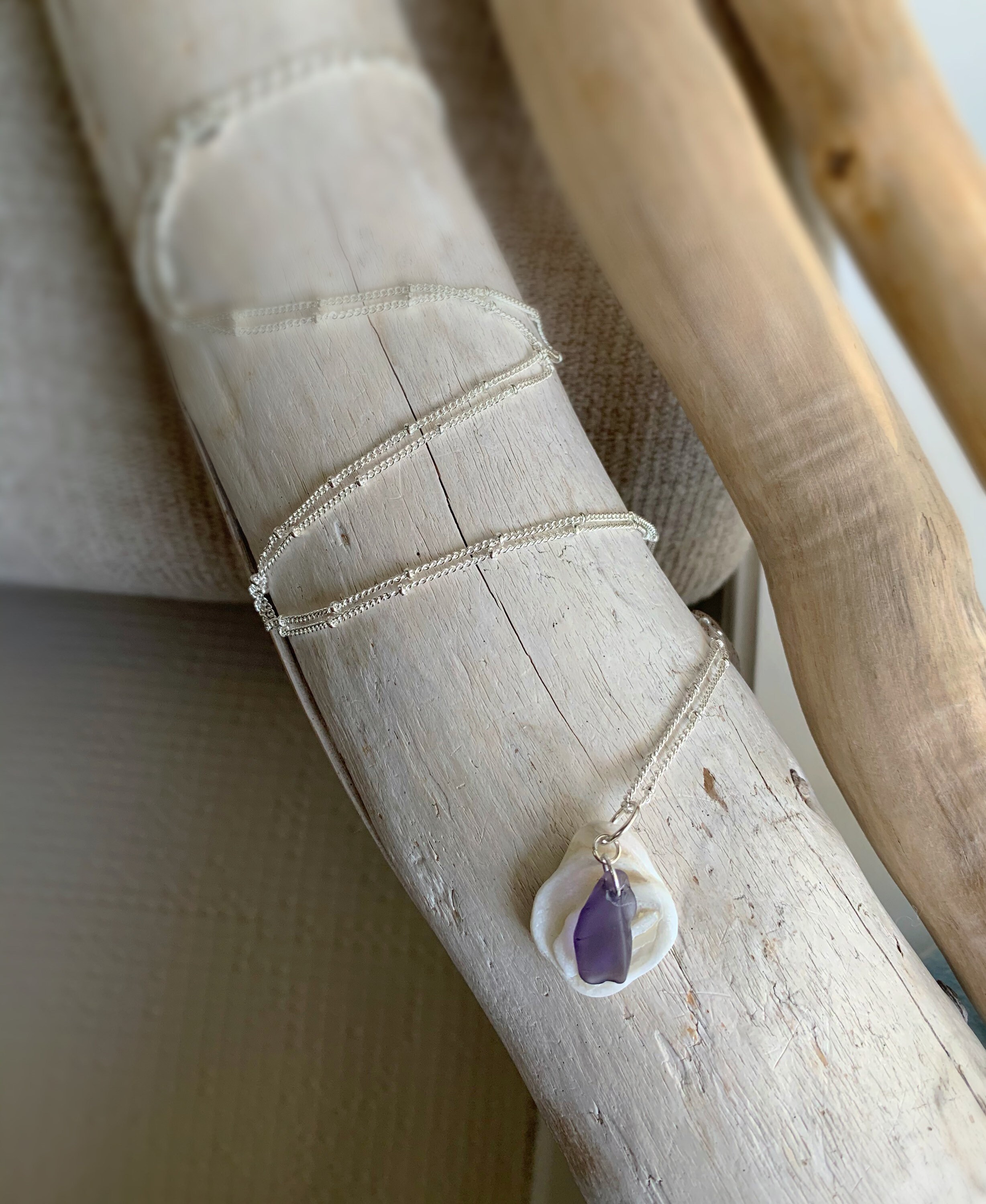 34” Necklace with Purple Sea Glass & Shell Pendant on a Satellite Style Silver Plated Necklace (with 2.5 inch extender, for extra length). This seaglass colour is rare and beautiful.